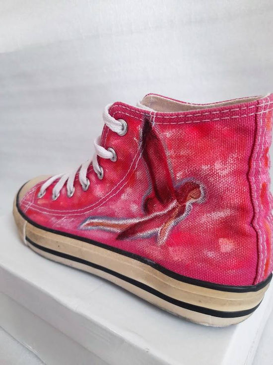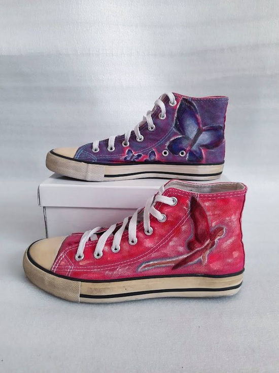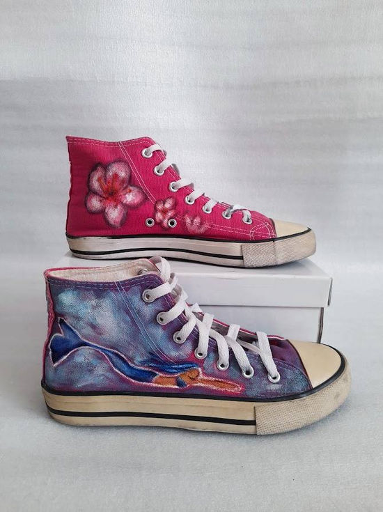 The Custom Painted Converse were inspired by mismatched items. I started with a fuschia pink Converse and I transformed it into one pink shoe and one blue shoe. I aimed to create harmony with the romantic painting style to even out the colour contrast.