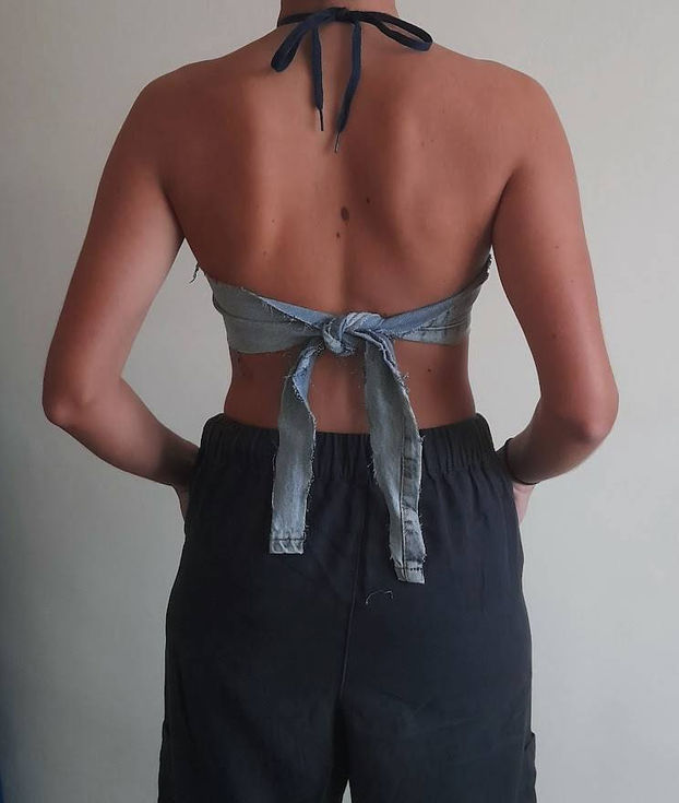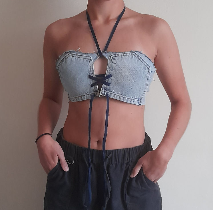The Denim Jean Pocket Top was made from 1 pair of jeans. I deconstructed the back pockets of the jeans and also the inner leg seam while also cutting along the length of the jeans. Finally, I hand sewed the pieces together.